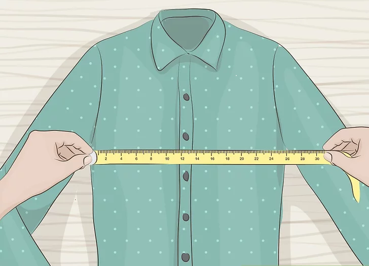 یکی از پیراهن هایی که از نظر اندازه و سایز مناسب هست ( پیراهن تابستانه باشد ) را روی سطح صاف پهن کنید، دکمه های پیراهن را ببندید. فاصله دوتا زیربغل را با متر اندازه بگیرید.